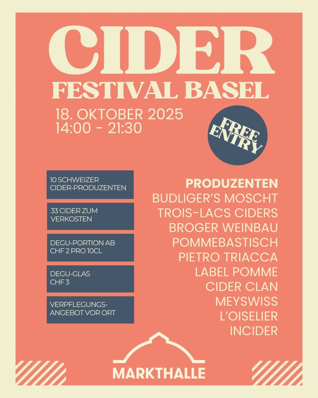 Am 18. Oktober 2025 findet in der Markthalle Basel das Cider Festival Markthalle Basel statt.